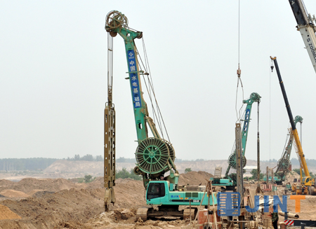 “龙湖工程”还未完结,上海金泰公司两台SG35A和一台SG40A已奔赴南水北调中线焦作段继续为祖国南水北调工程提供助推力。焦作段引水渠工程,坝体筑高8米,要求在坝体挖槽深15米、宽0.4米,该工程的难点在于有8米的回填土,容易塌槽。液压连续墙抓斗SG35A和SG40A针对水利水电施工建设特点,配合轻型薄壁斗和推板纠偏系统,施工震动小同时保证垂直度,提高效率的同时保证质量,给用户交上一份满意的答卷。