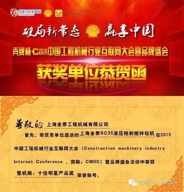 日前,由中国工程机械工业协会、长沙经济技术开发区、慧聪工程机械网等机构联合参与并举办的“CMIC2015中国工程机械行业互联网大会暨品牌盛会”系列活动之“2015年工程机械明星安博在线登录官网”评选结果“鸣锣定音”,上海金泰SC35双轮搅拌钻机荣获整机类“十佳明星安博在线登录官网”奖。