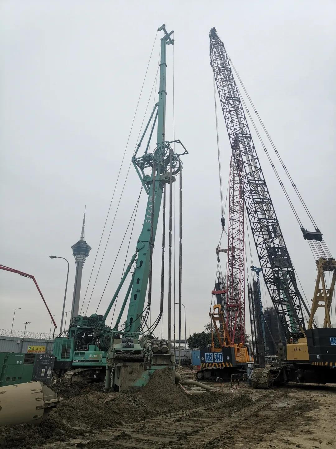经现场施工管理人员介绍:“临近西湾湖景大马路堤围加固工程算得上是钢筋混凝土地连墙教科书级工程,工地上可直面看到地连墙施工主流“抓铣”与“抓钻铣”的施工工艺,在金泰SX系列铣槽机、SG系列成槽机以及SH系列旋挖钻机的加持下,工程进度稳步向前,不出意外将与兄弟单位施工的粤澳新通道青茂口岸澳方联检大楼工地一样提前完成施工。
